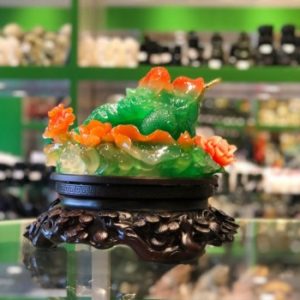 + Chất liệu và hoàn thiện: Thiềm thừ (cóc ba chân) xanh trên đảo hoa mẫu đơn, có đế gỗ, bột đá màu cao cấp (tại Việt Nam).